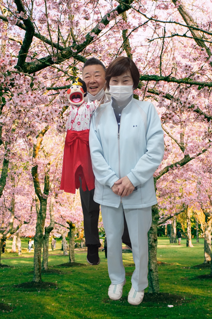 この写真は、尚和園で有名な人形師と人形のヒロコちゃん、そして河津桜よりも美しい所長でございます。