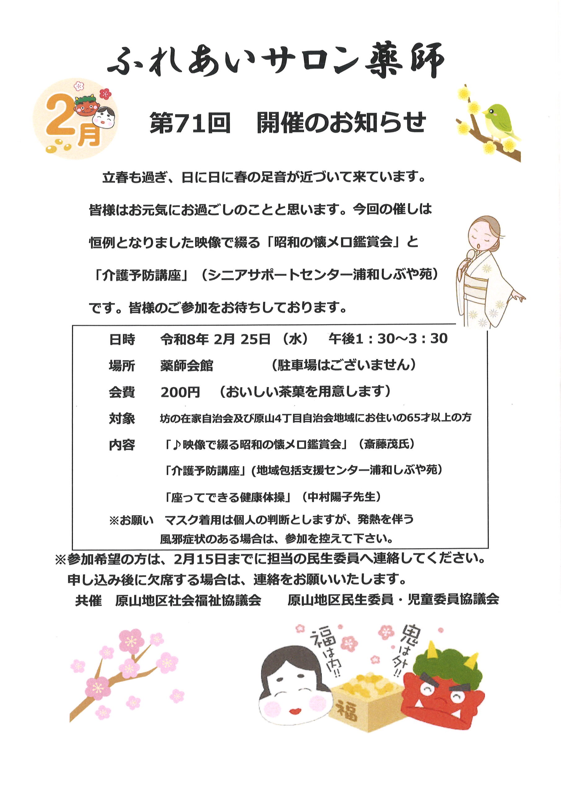 原山地区での高齢者ふれあいサロン活動に、健康講座、アクティビティ活動、体操教室等の担当者として出向いて運営に参画いたします。